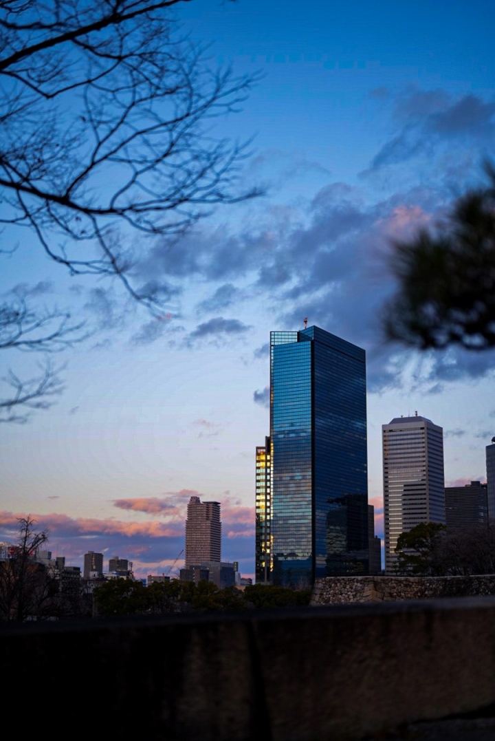 大阪城の天守を背に、視線の先には大阪のビジネス街。