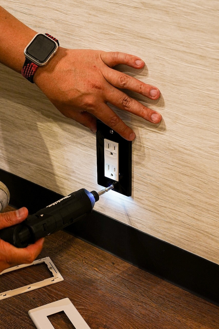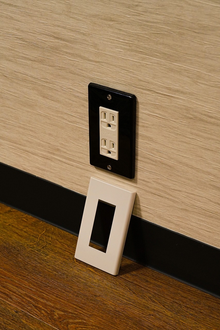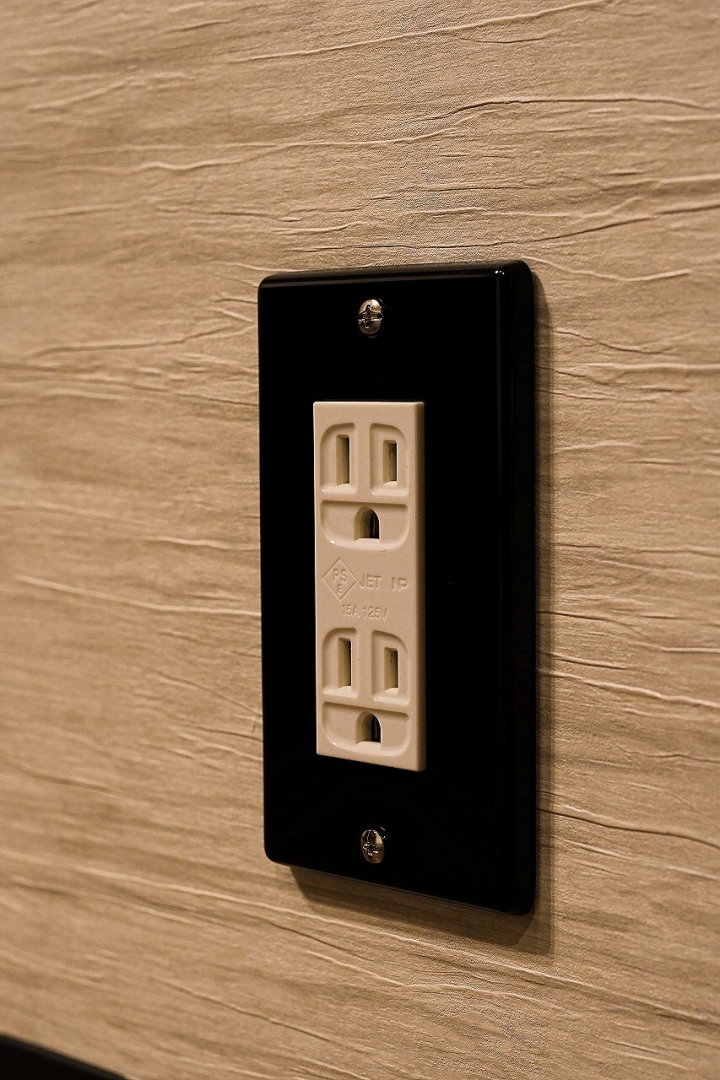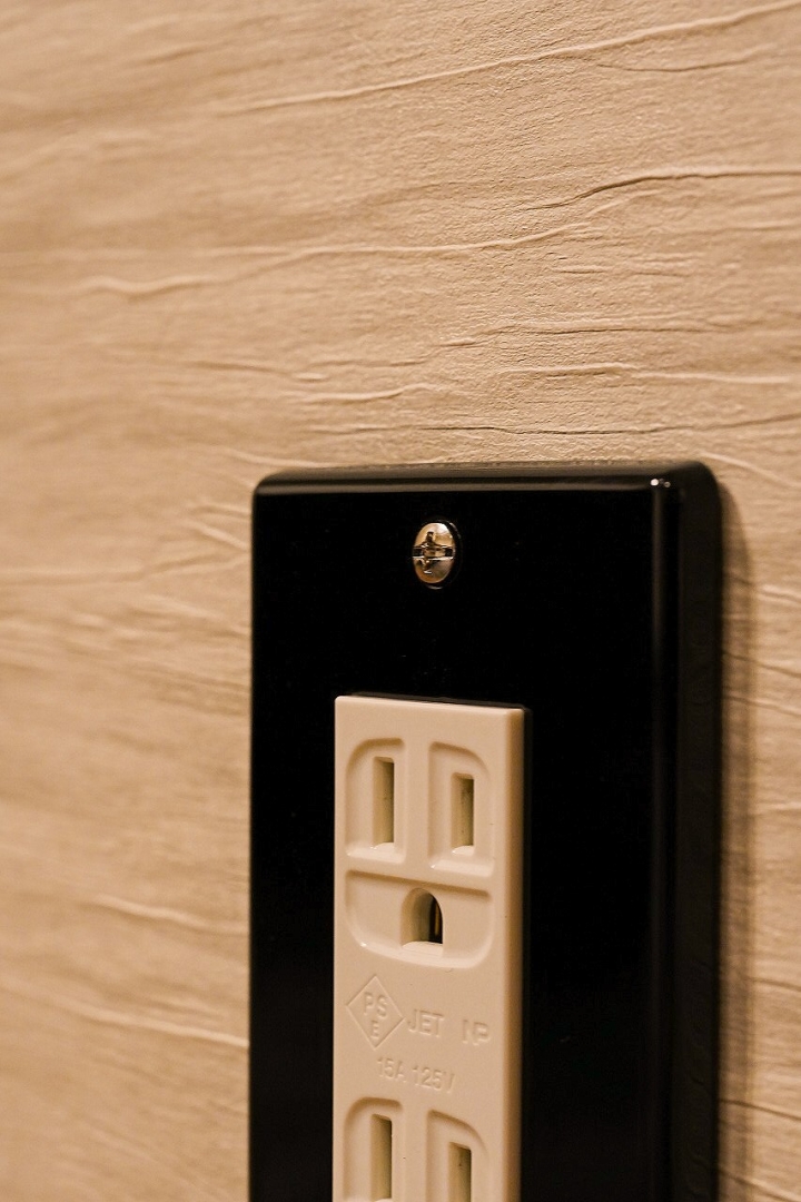 弊社(大阪オフィス)の来客応接コーナーにあります壁コンセントのプレートを漆塗りタイプへ交換します。